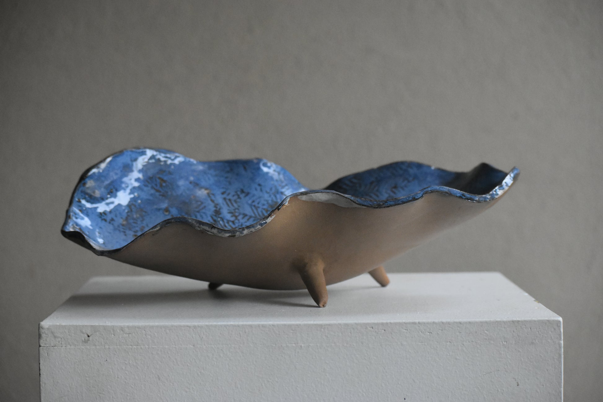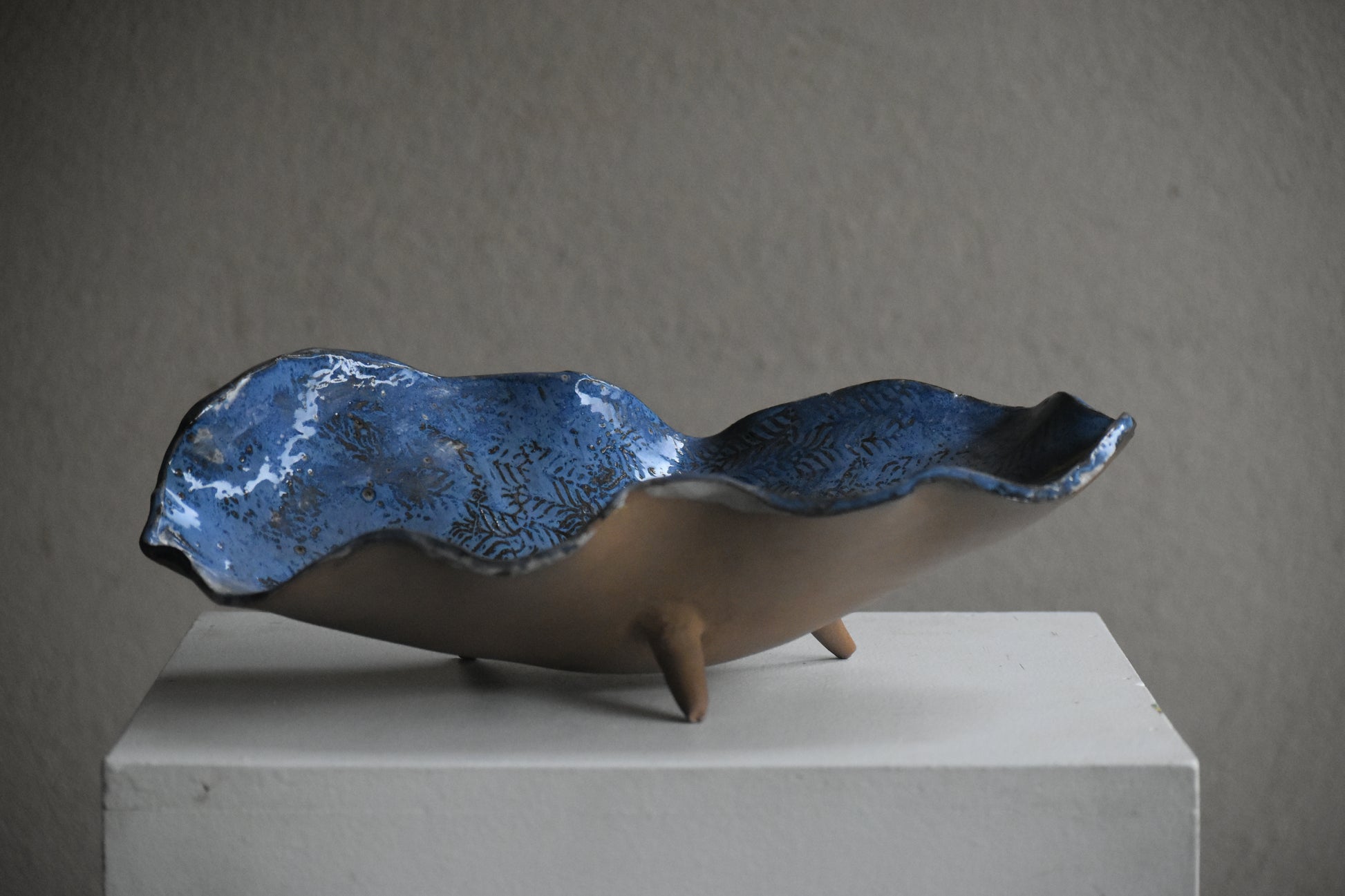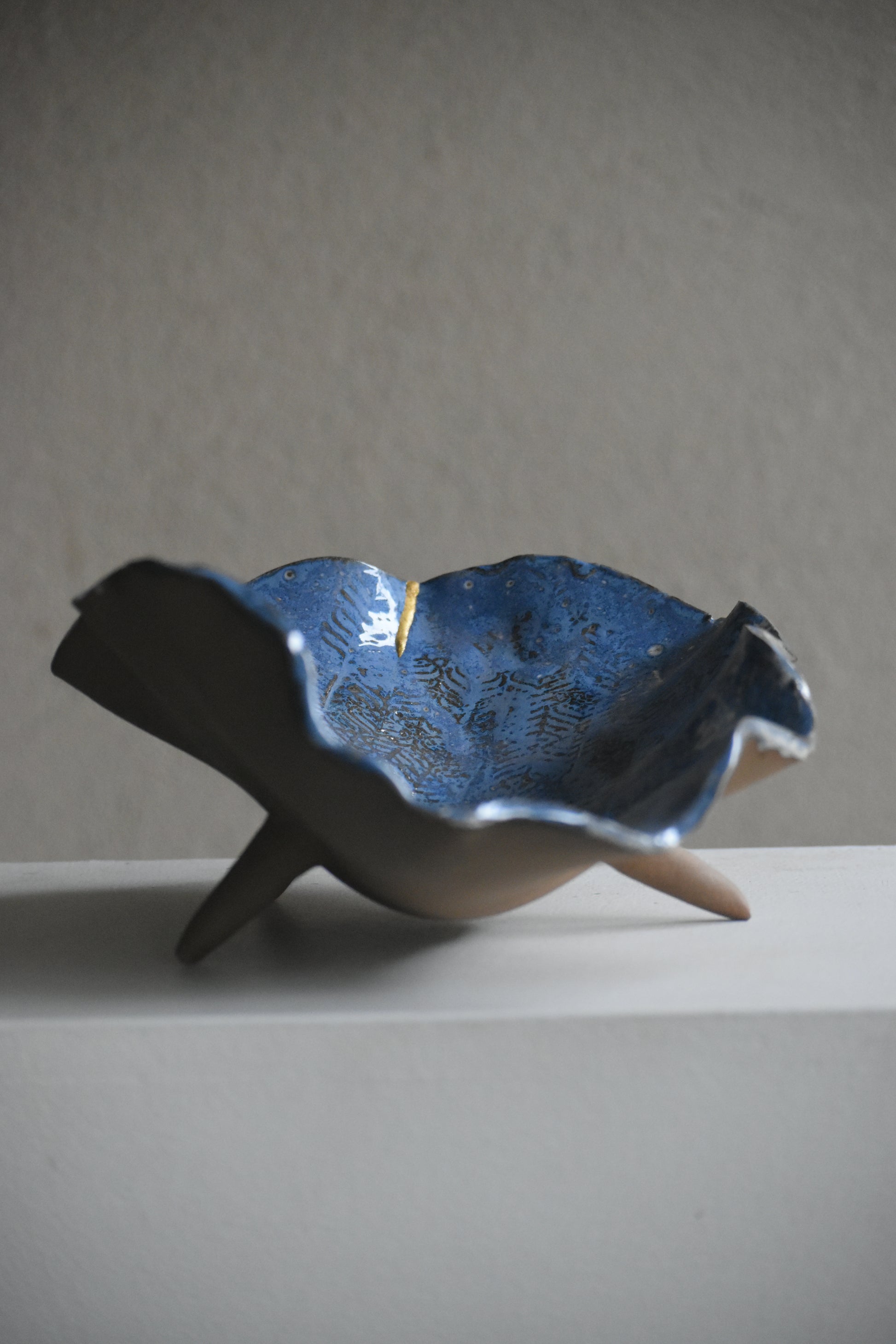 3 legged serving dish with a mottled glossy blue glaze with gold kintsugi detail.